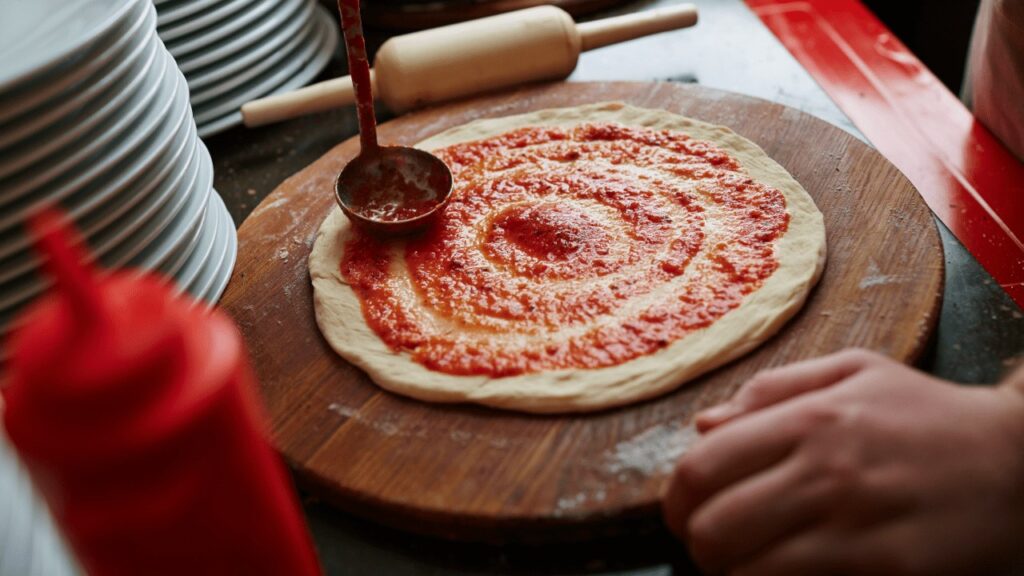 Pizza hamuru dinlendikten sonra yapılması gereken hamurun pizza yapımı için hazır hale getirilmesidir. Hazırlanmış olan hamur 3 parça haline bölünmeli ve yuvarlak hale getirilmelidir. Kenarlarından bastırılarak ve çatal yardımıyla ortasından bastırma yapılmalı. Bu ince detaylara dikkat edildiğinde hamur oldukça çıtır kenarlı bir şekilde pişecektir. Hamur bu şekilde hazırlandıktan sonra 170 dereceye ayarlanmış fırında yaklaşık 10 dakika pişmeye alınmalıdır. Hamurun pişmesi ile birlikte pizza salçası sürülerek pizza yapımının diğer aşamalarına geçilmelidir.