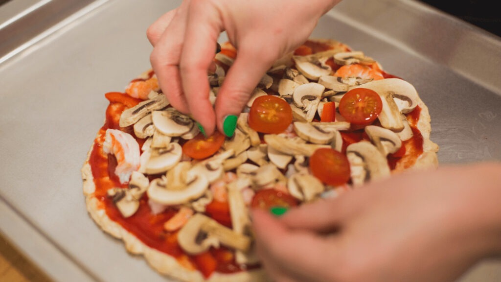 Herkesin kendisine özgü pizza yapma adamı işte tam olarak burada başlıyor. Pizza yapımına hazır hale getirilmiş hamurun üzerini isteğiniz doğrultusunda farklı malzemelerle doldurabilirsiniz. Ancak bu tarif içerisinde mantar ve kaşar peyniri kullanımı oldukça hoşa gidildiği için kullanılıyor.